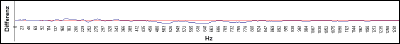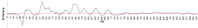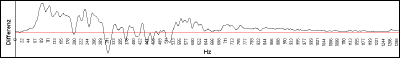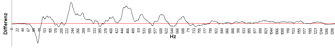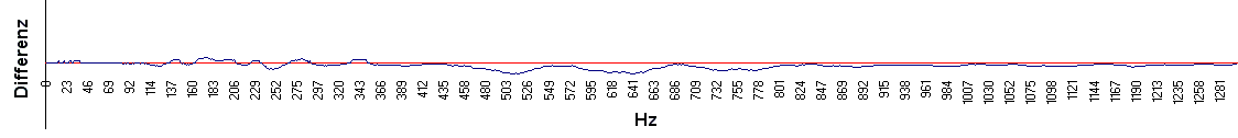 Die horizontale Linie entspricht 100% Übereinstimmung. Die Grafik zeigt die Differenz beider Stimmprofile. Die Auswertung ergab mit einem Übereinstimmungsfaktor von weit weniger als 50% keine Übereinstimmung der beiden Stimmproben. |